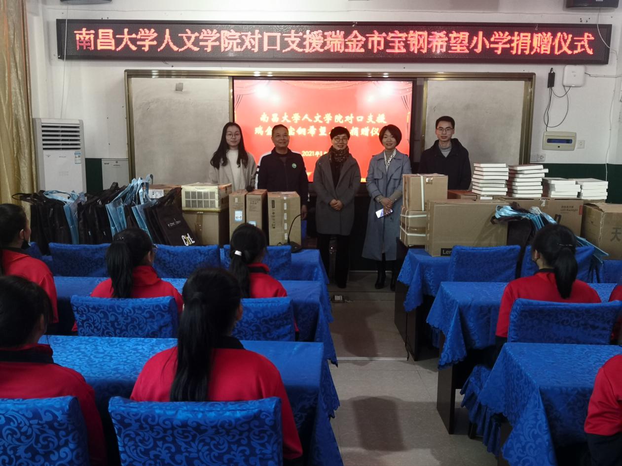 为响应《南昌大学对口支援瑞金市及瑞金经济技术开发区工作方案(2016—2020)》通知要求,切实做好扶贫帮扶工作,2021年1月21日,南昌大学人文学院副院长陈勤一行在瑞金市宝钢希望小学进行了物资捐赠活动。